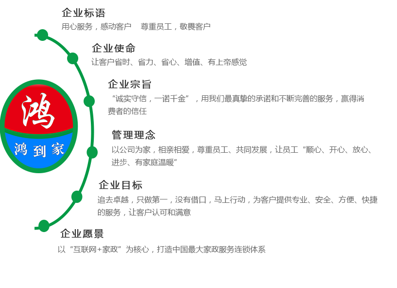 鴻到家家政所有服務(wù)人員都是企業(yè)員工,更好的把企業(yè)標準規(guī)范執(zhí)行下去,在服務(wù)過程中及服務(wù)過后有問題,客戶都可以找到我們解決。我們將秉承尊重員工、敬畏客戶的理念和不滿意、不收費的服務(wù)承諾為客戶提供方便、快捷、優(yōu)質(zhì)、安全的服務(wù)。鴻到家家政——百萬家庭共同的選擇!